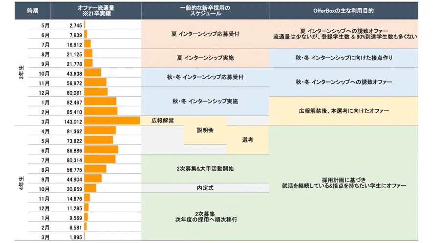 データの通り、オファー流通量は大学3年生3月〜6月にかけてピークを迎え、その後少しずつ減少していきます。