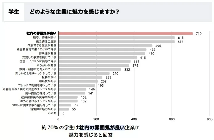 株式会社i-plugの調査によると、約70%の学生が「社内の雰囲気が良い」企業に魅力を感じると回答しました。