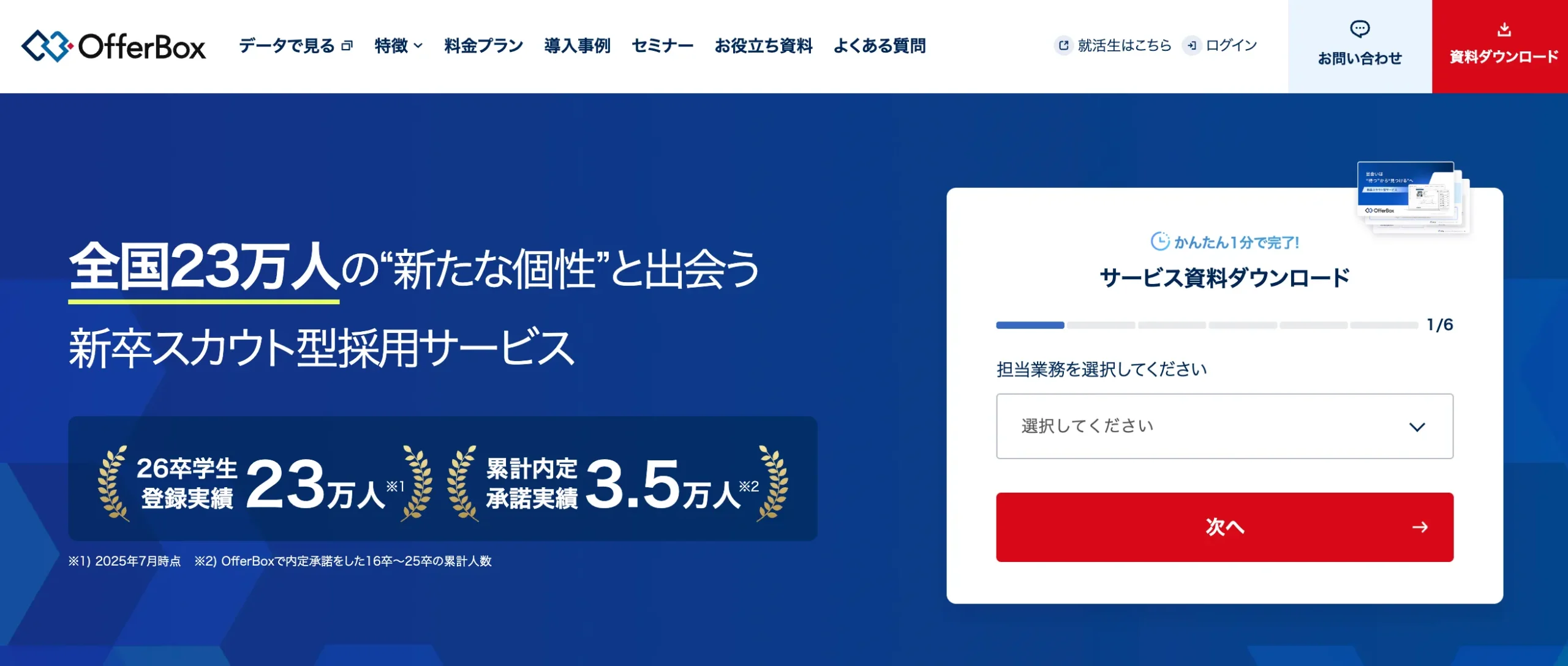 | OfferBox | 24万4000人(2024年卒学生登録数) | 旧帝大・日東駒専:11% MARCH・関関同立:20% 日東駒専・関関同立:11% | 82%(プロフィール入力率80%以上の2023年卒学生の数値より算出) | 【早期定額型】 10名 250万円 5名 125万円 3名 75万円 【成功報酬型】 38万円/1人 |