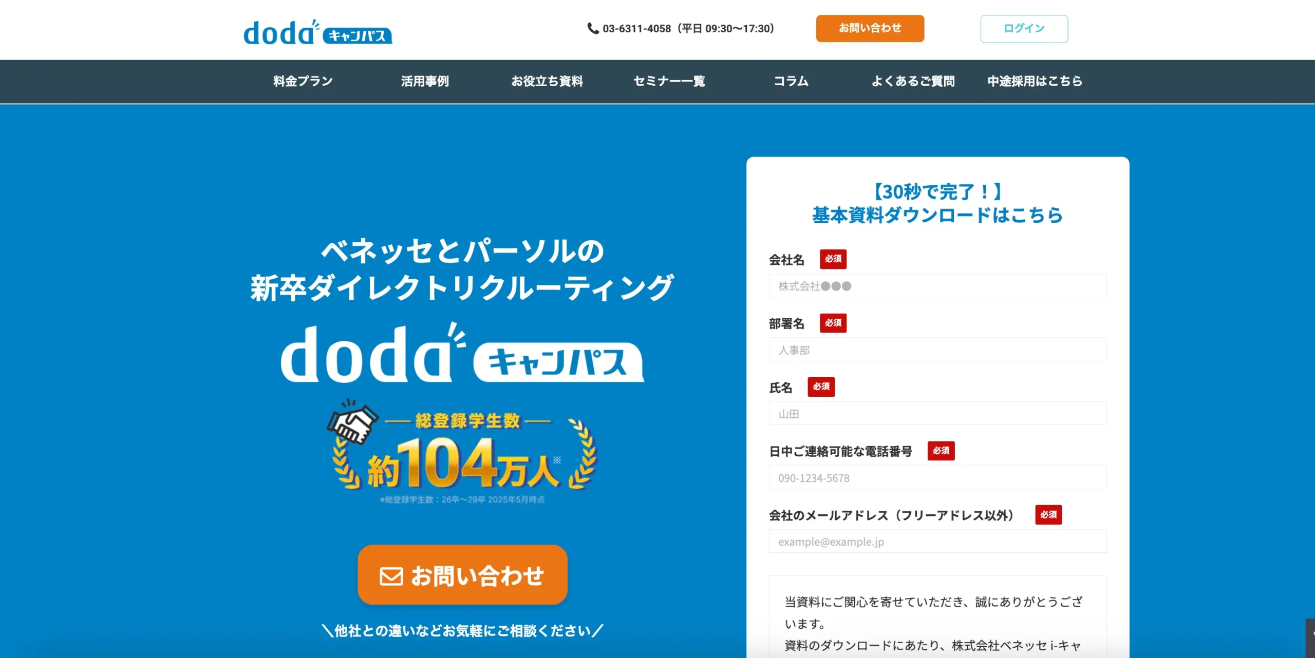 | doda キャンパス | 約113万人(25卒~28卒) | 非公開 | 非公開 | 【定額制】 3名プラン:60万円 5名プラン:75万円 無制限プラン:90万円 【成功報酬制】 成功報酬35万円/1人 |