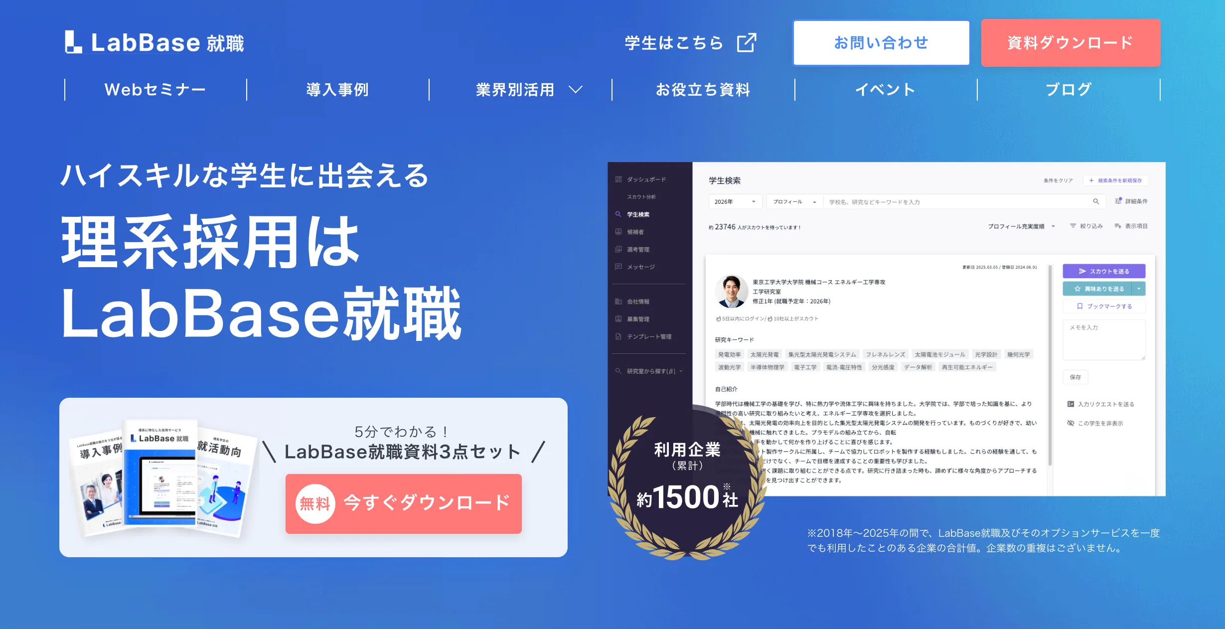 | LabBase | 全国AI学生の2人に1人が登録 | 東大・京大・旧帝大:28.9% 早慶・筑波・理系専門:23.9% MARCH・国公立大学:33% | 90% | 成果報酬なし 月額料金のみ |