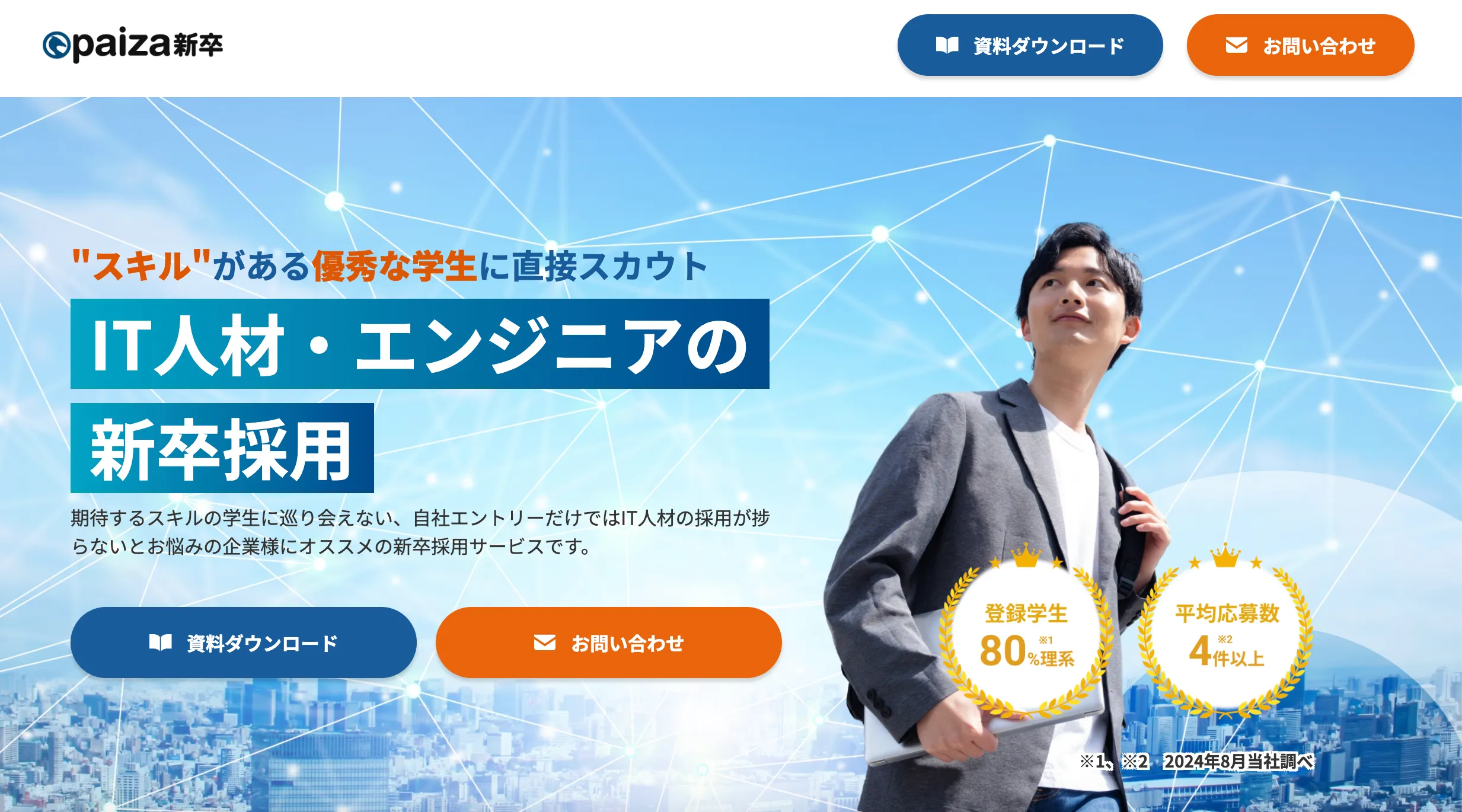 | paiza 新卒 | 非公開 | 旧帝大・早慶:20.6% MARCH・関関同立:9.6% | 非公開 | 成果報酬60万円~/1名 |